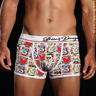The brand is all about youthful energy and being young at heart and the provocative and quirky designs speak for themselves. With names like "I Love Boys" and & "I Love Buddha", these undies are sure to become favourites in your top drawer. The waistband has to be seen to be believed! It features raised lettering of the Piss & Vinegar logo and is ushering in a new era of the 'waistband above the jeans' look.